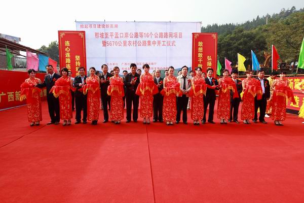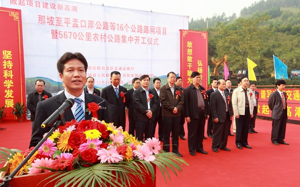 為貫徹落實自治區(qū)黨委、政府在全區(qū)掀起項目建設(shè)新高潮的決策部署,沖刺第四季度,完成全年公路建設(shè)目標(biāo)任務(wù),自治區(qū)交通運(yùn)輸廳于11月3日舉行全區(qū)公路路網(wǎng)改造項目集中開工儀式。由集團(tuán)公司承辦的分會場——那坡至平孟口岸公路等16個公路路網(wǎng)項目暨5670公里農(nóng)村公路集中開工儀式在百色市那坡縣德隆鄉(xiāng)隆重舉行。自治區(qū)交通運(yùn)輸廳紀(jì)檢組長、廳黨組成員朱名勝,百色市市委常委、政法委書記周武紅,市人大常委會黨組成員黃五同,集團(tuán)公司黨委書記、董事長朱堅和、總經(jīng)理李定倫、黨委副書記張友坐、副總經(jīng)理劉明洪、總工程師覃炳賢,自治區(qū)公路管理局、百色市公路管理局、交通運(yùn)輸局、那坡縣四家班子、集團(tuán)公司直屬各單位領(lǐng)導(dǎo)及有關(guān)部門負(fù)責(zé)人等出席開工儀式。