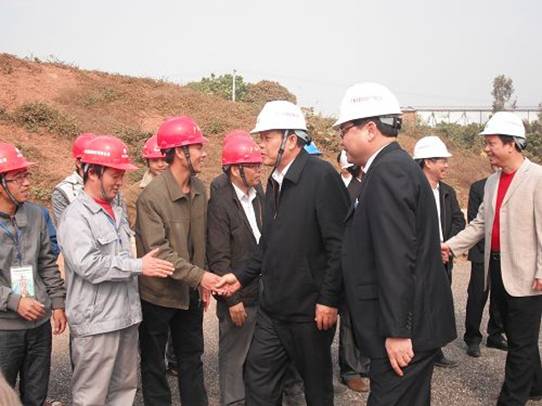 當天,楊道喜副主席來到玉鐵5標K56+365.291沙田互通建設現(xiàn)場,當看到著裝整齊、精神抖擻的廣西路橋員工隊伍,感受到大干旱季、沖刺收尾階段的熱烈氣氛時,楊副主席上前與項目員工一一握手并親切問候到:“廣西路橋的員工,你們辛苦了”。他鼓勵廣西路橋建設者要做好廣西交通基礎設施建設的排頭兵,在確保質(zhì)量、安全的前提下,克難攻堅,全力推進工程建設進度,堅持年底完成全線主體工程的目標不動搖,為玉鐵高速公路的建設做出積極貢獻,為推動廣西經(jīng)濟社會又好又快發(fā)展做出新的更大貢獻。
