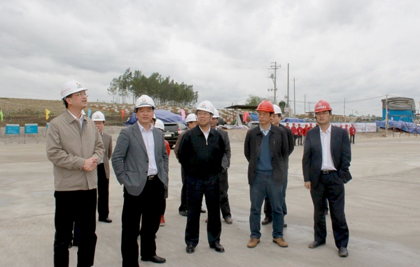 圖為:交通運(yùn)輸廳副廳長梁毅(右二)、崇左市委書記趙樂秦(右三)、崇左市副市長張鴻(左一)在項(xiàng)目現(xiàn)場檢查調(diào)研
