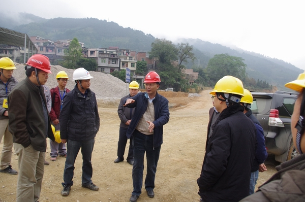 圖為集團公司總經(jīng)理李定倫(圖中)、總工程師覃炳賢(右二)在那平路項目施工現(xiàn)場指導工作