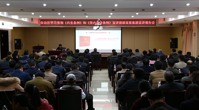 2017年2月24日上午,自治區(qū)學(xué)習(xí)貫徹《中國(guó)共產(chǎn)黨問(wèn)責(zé)條例》《中國(guó)共產(chǎn)黨黨內(nèi)監(jiān)督條例》宣講團(tuán)到集團(tuán)公司舉行宣講報(bào)告會(huì),自治區(qū)紀(jì)委宣傳部部長(zhǎng)陳柳青作宣講報(bào)告,集團(tuán)公司黨委副書(shū)記、副董事長(zhǎng)、總經(jīng)理唐咸秋主持會(huì)議。