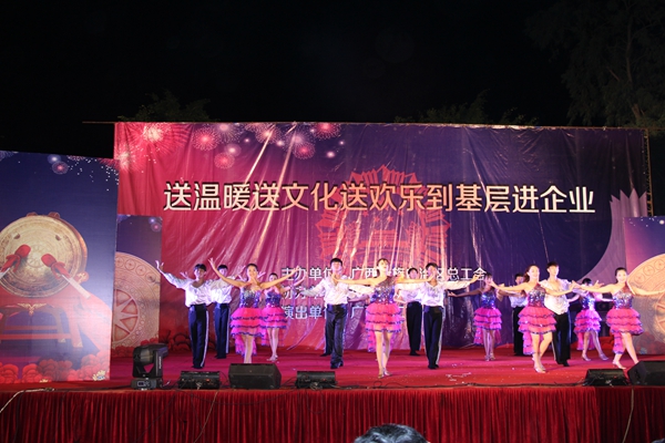 晚上,自治區(qū)總工會(huì)安排了豐富多彩的慰問演出。整場演出以“勞動(dòng)托起中國夢”為主題,載歌載舞,奏響勞動(dòng)光榮的時(shí)代主旋律。慰問演出在富有壯族文化風(fēng)情的《廣西尼的呀》的舞蹈中拉開了序幕,既有《力與美》的高難度雜技表演,又有詼諧幽默、勵(lì)志感人的小品《為愛加油》,配樂詩朗誦《心儀廣西》展示了廣西壯鄉(xiāng)的山好水好前景闊,更有優(yōu)美的舞蹈《魅影》、《工匠精神》等節(jié)目更是歌頌了勞動(dòng)之美。路橋集團(tuán)員工還帶來配樂詩朗誦《萬里征程品為本,行穩(wěn)致遠(yuǎn)前景闊》和小品《工地愛情故事》,展現(xiàn)了路橋職工的風(fēng)采。慰問演出在歌舞《不忘初心》中畫上了圓滿的句號(hào),路橋建設(shè)者們在這場文化盛宴中度過一個(gè)難忘的夜晚。