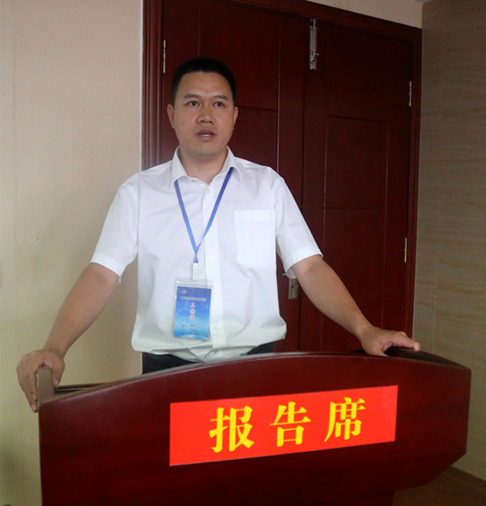 圖二:新恒通公司黨委副書記、副董事長、總經(jīng)理、總工程師藍(lán)日彥在本部站為活動致辭